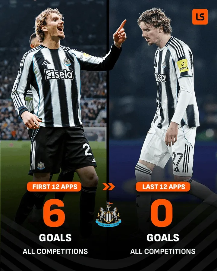 虎扑02月06日讯 根据LiveScore的统计,沃尔特马德在加盟纽卡斯尔联的前12场各项赛事中打进了6个球,但是在最近12次出场中,沃尔特马德颗粒无收。在经历了美妙的开局之后,沃尔特马德在纽卡斯尔联的境遇出现了反转。来源:X 虎扑02月06日讯 根据LiveScore的统计,沃尔特马德在加盟纽卡斯尔联的前12场各项赛事中打进了6个球,但是在最近12次...