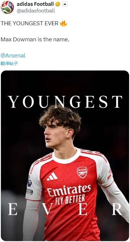Opta统计,16岁73天的道曼成为了英超历史上最年轻的进球者,当然同时也是阿森纳队史最年轻的英超进球者!